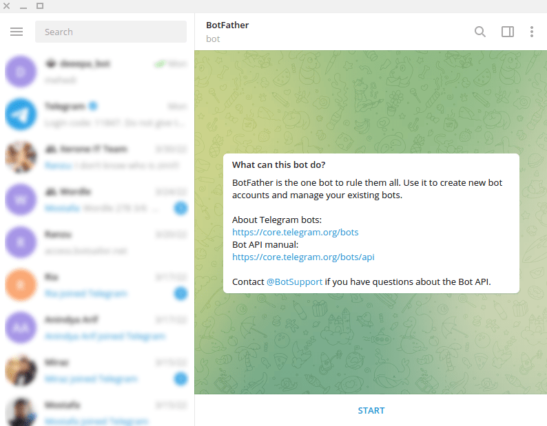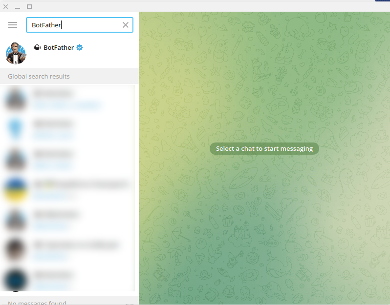 To build a Telegram bot with Moakad, first, open your Telegram App. Then in the search bar of the app, search with the ‘BotFather’ keyword. Then select the verified BotFather account.